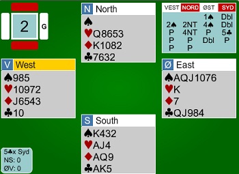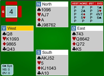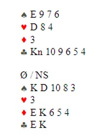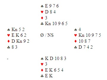 Jørn Arild får hjerteresset ut og skift til ruter. Han tar for KD i spar og fargen sitter singel til venstre og tre til høyre. Så ta han for EK i kløver og begge følger. Nå sier Jørn følgende. "Jeg spiller spar til esset og stjeler en kløver", samtidig som han lener seg fram og viser fram kortene et øyeblikk. Akkurat hva som skjedde videre, er jeg ikke 100% sikker på. Når en snakker med bridgespillere om slike ting, er det i alle fall ikke mulig å få et helt objektivt svar, men faktum er at når Jørn spiller spar til esset og kløver fra bordet, så følger øst med syveren!! Han tar kortene til seg og ber om å få spille ferdig spillet likevel. Hva er det som skjer? tenker du nå. Dette er jo ikke mulig fordi det er bare kløverdamen ute. Tell kortene og så ser du at det er et kort for mye i bordet. Jørn har telt seks kløver, men det er bare fem i virkeligheten. Bordet har altså kun Kn109xx. og nå ser du sikkert at han må gjette rett i kløver for å vinne 6sp. Hele spillet er slik: Aktuelt gjetta Jørn Arild rett og seilte kløverknekten. Ikke unaturlig tilkalte motparten turneringsleder og ba om en vurdering av det som hadde skjedd. Turneringsleder bestemte at det var foretatt en claim og spillefører kunne ikke ta en finesse lenger. Appellutvalget var enig og jeg har ingen planer om å mene verken det ene eller andre om konklusjonen. Det eneste som er helt sikkert er at Jørn Arild "KingKong" Ringseth ikke har noen andre enn seg selv å takke for at han havnet i situasjonen. Hadde han telt antall kløver i bordet hadda han stjelt de to små ruterne sine i bordet i stedet for å gå på kløveren. Da hadde den trettende ruteren stått og det samme hadde kontrakten gjort. Jeg synes likevel synd på Jørn Arild og det er aldri noe moro når slike ting skjer. Ikke for noen av partene. Siden jeg er en oppsøkende journalist, alltid på jakt etter nyheter, ba jeg Jørn stille til en rekontruksjon av det som hendte. Den kan du se under ved å trykke på bildet.