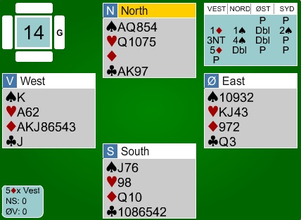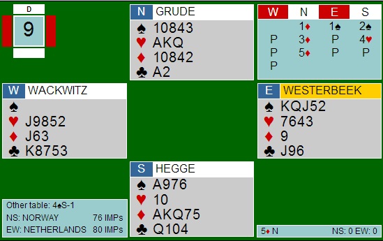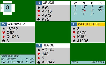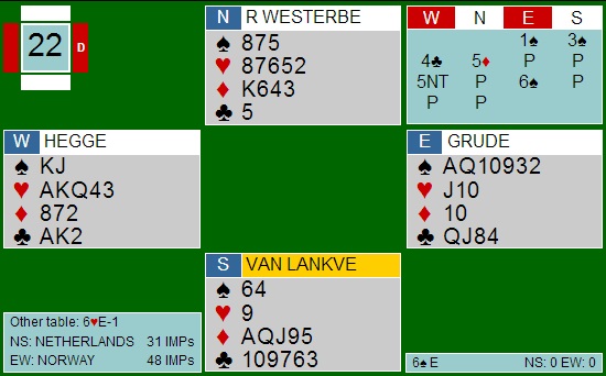 men det er nok dessverre mer rett å si at Norge skyter seg i foten. Det ble rett og slett meldt for mye og for hardt av de norske. I spillet under melder Kristian B Ellingsen steinhardt, i alle fall hvis makker i nord har bare tre spar med sin 2kl. 6sp kunne stått, men gikk et par beiter etter en normal spilleføring Her er det Harald Eide i Nord som jeg tror melder en gang for mye. 2NT er jeg ikke sikker på om de spiller som Lebensohl (overføring til 3kl for å vise en svak hånd) eller Scrable ("Jeg har to steder å spille"). Uansett gikk lyset når han meldte 4NT og ba makker velge minor. Han ble hardt straffet og -1100 mot et par beiter i 4sp x på det andre bordet. Lagene var dyktige i mange spill denne halvrunden og tre 6kl på rad er det lenge siden jeg har sett i en lagkamp. Dette er Nederland sin liste, men Norge kopierte!! Utspillet svingte ni stikk!! Jeg synes Hegge - Grude (over) hadde en fin meldesekvens ØV til 5ru. 4sp kan vel vinnes med forsiktig (og rett) spilleplan, så uttaket i 5ru var veldig rett. På det andre bordet kom ØV (Nederland) i 3NT ! etter et rart meldingsforløp når vest valgte å vise hånda som en balansert 20-21 NT. Kløver ess i utspill og Norge hadde tatt de ni første. Harald Eide startet med derimot med en liten spar og da kunne Nederlanden ta resten siden nord ble skviset i alle farger!! +550 ga bare ett IMP. Nederland er foran med 10 IMP før de siste 14 spillenen.