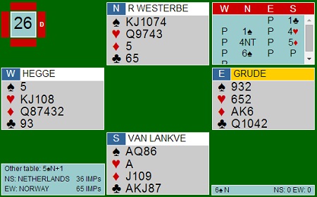I lagbridge handler det ofte om å melde de rette slemmene. I spillet under kom Nederland bare i utgang, mens Eide- Ellingsen meldte seg lett fram til 6hj. Du ser ikke starten av meldingsforløpet, men det gikk 1hj-2ru-2hj-3hj-3sp fram til Kristian Barstad Ellingsen meldte 3NT ("Jeg er interesssert enda"). Harald var flink når han tok opp enda en gang . Slike slemmer ser veldig lett ut å melde etterpå, men selv om vest har fine honnører er det en tam hånd han har, I første sesjon gikk den ene Nederlenderen amokk og skulle teste gliden. Hadde dette gått bra, ville han hatt et gedigent mentalt overtak. Han gikk fortjent to dobla beiter og masse IMP ut mot 420 norske poeng på det andre bordet. Så løp Hegge - Grude seg inn i et systemhull jeg tror de deler med mange av oss andre. Over 3kl ønsker Kristoffer å komme med en mild sleminvitt i kløver. Han har bare 13 hp, men fine kort hvis de passer med makker sine. Problemet er at 3kl over 2ru vil være spørsmål om videre fordeling og det vil ikke gjøre han så mye klokere, i alle fall hvis han ikke får minst firekort kløver i svar. Derfor hoppa han bare til 3NT. Nederland meldte og vant 6kl. Slik det sitter, spiller ikke den kontrakten seg selv med f.eks et rødt kort ut fra vest. Det er ikke verre enn at etter to ganger trumf, må spillefører passe på å spille spar mot ED to ganger sånn at ikke en honnør blir stjålet, fordi da kan øst spille sin fjerde trumf og syd ble hengende med en spartaper. Så var Norge litt heldige når øst meldte inn sparen sin. Da fant vi heldigvis ikke 4-4 i spar, men havna i 5ru i stedet. 4sp kunne ikke vinnes med 5-0 sitsen, men i ruterkontrakt forsvant det små spar på hjerteren: Så kom enda en slem der Norge meldte bra. Det virker som 3sp viser begge minor og da betyr 4kl fra Kristoffer at han har hjerterfarge. Over 5ru gir han makker muligheten til å velge slem med 5NT. Gi Øst en hjerter mer og en spar mindre, så vil de komme i 6hj. På det andre bordet ble Nederland også presset sånn at de kom i hjerterslemmen. Med to ganger ruter i utspill, vokste det fram et hjerterstikk i nord. :-) Nederland kan også melde og blåste ut i denne 25 hp-slemmen i spar. Norge var på vei, men stoppa på 5-trinnet. Denne kontrakten spiller heller ikke seg selv med EK i ruter ut, men det ble tolv stikk på begge bord.