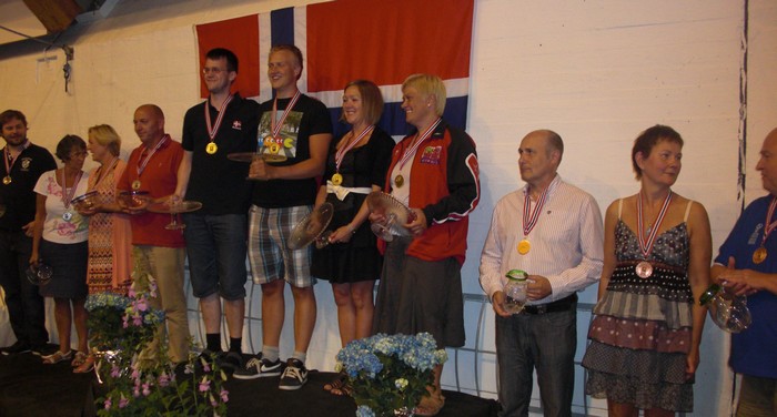 Over er pallen fra NM mixlag med "To gamle og to gode" på andreplass, vinnerne fra Sømna og "Hauge" på tredjeplass. 3/5 av vinnene i Patton. Rogeir Paulsen; Sjur Arne Bøe og Jon Egil Furunes. De andre på laget var Geir Helgemo, Per Arne Flått og Håkon Kippe.