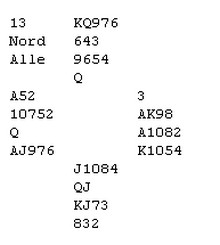 Utspillet var tre ganger ruter til stjeling i bordet, og deretter en kløver til damen og dukk fra Syd. Harald tenkte seg godt om og spilte på den eneste muligheten for hjemgang: Tre ganger trumf og kløver til Syds ess. Han hadde ingen ruter igjen, og dermed deilige 420 og 7 imp.