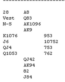 Jeg har skrevet mange artikler om denne konvensjonen før og her kommer enda en. Som sagt sliter jeg med å se oppsida, selv om tilhengerne til stadighet kaller meg trangsynt og reaksjonær. En god venn av meg fra Larvik er den som blir våt i buksa hver gang har har et ess, en konge og en knekt utenfor sonen. "Dette blir pluss, makker", sa han da han gikk 1700 i 2ru dobla i spillet under. "De spiller akkurat samme konvensjonen på andre bordet og med et enkelt motspill er det åtte beit, null stikk og 2000 å bokføre. 8 IMP til oss!" Espen Erichsen og Simin Gillis hadde avtalene i orden. Vest åpnet med 1NT (8-12), nord doblet og øst tok ut i 2ru som viste 4-4 i rødt. Pass fra Gillis er krav og Espen dobla på nytt som straff. Pass rundt. På det andre bordet hadde ikke undertegnede samme tette avtaler og slapp ØV av kroken. Skuffende av meg å ikke ha diskutert denne possen, i alle fall når jeg hadde 2000 inn mot kaninen som spillefører. Den "forventa" åtteren inn ble 14 ut i stedet.