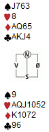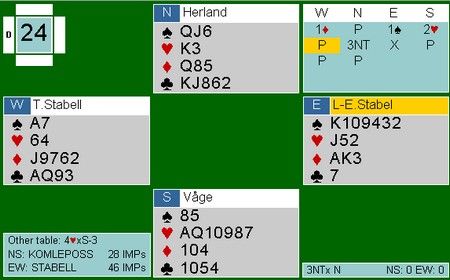 Hvis du sitter i andre hånd og melder inn på 2-trinnet over motpartens åpning, er de fleste enige om at det nornalt viser en åpningshånd. Når begge motstanderne har meldt og makker har passet i andre hånd, synes jeg ikke det trengs å stille de samme krav for å gå inn. Det kan være helt avgjørende å få vist en farge slik at makkerparet kan finne beste utspill mot motpartens kontrakt. Det er viktig at makkerpar har diskutert denne posisjonen. Jeg er helt enig med John Våge sin 2hj. Når begge motspillerne har meldt, er det lite sannsynlig at vi har egen utgang og da bør det kunne være ok å vise ED109xx. Iikke minst hvis vest kommer til å gjenmelde NT og makker får utspillet. John Helge Herland tok imidlertid litt av og måtte blø for det. Var det ikke litt mange honnørpoeng i omløp i spillet, John Helge Herland, når du kikka ned på tolv stykker av dem? Eller kanskje ØV drev med fanteri? :-) Meldingene gikk akkurat likedan påd et andre bordet, men der tok syd ut i 4hj. Det kosta "bare" 500. Mot 3NT dobla spilte brødrene Stabell perfekt i mot. Ruter ess ut og makker la toeren. Skift til spar og ruter knekt som spillefører la liten på. Ruter til esset, spar konge og kløver til esset. Der venta enda to ruterstikk og 800 i beit. John Helge Herland