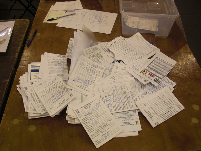 Jeg har gjentatte ganger klaget på at norske par ikke stiller med systemkort. Dette gjelder like mye i par som i lag. Rett og slett uhøflig, spør du meg. Reglene sier at det skal være være med til bordet og sånn er det med den saken. I Sverige er det uhørt å ikke ha systemkort og turneringsleder slår ned med hard (flat?) hånd mot de parene som slurver. I Norge gies det ethundreogfemtitre advarsler, og så rister alle ansvarlige på hodet og gir opp kampen. Dette er som jeg hører min gamle mor i oppvekstsen. "Nå har jeg sagt tusen ganger at du skal sette skoene dine pent på plass, Snorre, og når sier jeg det for tredje og siste gang!!". Jeg hørte ikke etter henne før hun tok lommepengene og lørdagsgodteriene fra meg. Noen har med systemkort, men halvparten blir liggende igjen. Staben rydder og her er resultatet