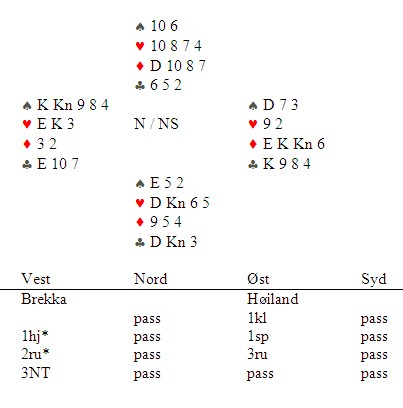 Du ser at nord allerede har måtte kaste hjerterholdet sitt for å holde tre ruter. Inne på hånda spiller Geir ruter til knekten, men på ruterkongen er det syd som må kaste inn håndkleet. Glimrende spilt og herved innstilling til Festivalens beste spill.