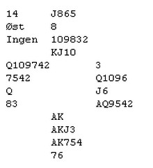 Spillefører i syd skal få være anonym, men ryktene forteller at han rødmer enda, to dager etterpå. Han skulle spille 3NT og fikk spar ut til esset. Han skjekket at ruteren sto og spilte så kløver til tieren. Uten å mukke la Arnfinn Johansen i øst en liten tass. Spillefører ante fred og ingen fare når han gikk hjem på hånda og spilte nok en kløver. Han regnet med å få sine tolv stikk, men det fikk han ikke. SLETTES IKKE!!