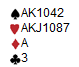 Geir visste at makker hadde 3-2-4-4 fordeling og 13-16 hp. De bruker 8-12 NT i åpning i disse soneforholdene. Da hadde de 28-30 hp til sammen og det er mer attraktivt å spille NT på 5-3 i major dess sterkere hendene er. Denne gangen ser Geir at er hjerter kan stjeles på den korte hånda i spar, men makker kan jo ha damen eller Kn10 sånn at det ikke er bruk for stjelingen? Derfor 3NT og ruter åtte kommer ut. Geir ser at i 4sp er det mange sjanser til tolv stikk. Hjerteren kan stjeles og ruteren kan enten kappes på knekten eller knekten kan stjeles god. I tillegg kan det være en skvis i minor. Derfor så han at han nok måtte ha tolv stikk for å få et godt spill. Oppsida var at 3NT med 12 stikk sannsynligvis ville være en svært god score. Geir stakk med ruteresset og presset ut sparesset. Syd vant andre gang og spilte hjerter til esset. Tre ganger spar og nord kaster to kløver og en hjerter, syd kaster en hjerter og en ruter. Så kløver til kongen og kløver til esset. Stillingen er som under.