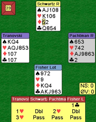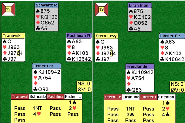 og da er det godt å se at et av verdens aller beste par også sliter. Jeg har ikke teorien helt på plass selv, men poenget er at vi for ofte leiter etter 4-4 tilpass i major når vi har 5-3/6-3 i den andre majoren. Her er det Lotan Fisher og Ron Schwatz som kommer i 4hj. Trumfen 4-1 og ruter ut gjorde det til et slitsomt prosjekt som endte med beit fordi sparfargen ble død når syd ble kortet i utspillet. På det andre bordet virker det som Liran Iron har skjønt noe svært viktig. Han ser at det er ikke er noe poeng å spille på 4-4, men søker heller 5-3 tilpassen. Den femte trumfen reduserer sjansen for å bli trumfmatt. 4-4 er sårbart for skeiv sits. Denne gangen traff Liran Iron makker med seks spar, men selv 5-3 kan være rett i slike spill. 4sp spilte seg greit til ti stikk. Jeg utfordrer en av dere eksperter til å lage en artikkel om dette. Tema: "Når skal vi spille på 5-3 vs 4-4 i trumf?"
