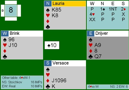 Så kløver til stjeling med den siste trumfen og du ser sikkert hva som skjer nå. Vest har allerede fått åtte stikk og trenger to til. Nord må derfor stjele over og avslutte med å spille fra 85 i spar opp i 96. Det var akkurat nok til at 4hj redobla gikk hjem.