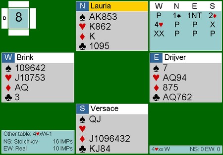 Lagturneringa i Monaco er i gang og der spilles det nå syv kamper a 10 spill før sluttspillet starter i morgen (tirsdag) ettermiddag. De to beste møtes da i en 20-spillskamp for å avgjøre seieren, mens de andre 14 lagene spiller Monrad om tredjeplassen. Thor Erik Hoftaniska og Thomas Charlsen spiller for engelske Janet de Botton og var på BBO i tredje runde. Kampen endte 23-23, ikke minst takket være denne tøffe slemmen av nordmennene.