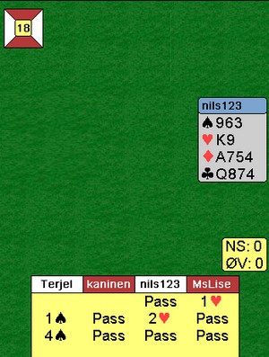 Det spiller ingen rolle om makker har passa eller ikke i åpning. Du sitter på halvparten av honnørstyrken etter meldingsforløpet så det er bare å jobbe. Sitter du på 3 3 i hjerter og passer 2hj, er det langt mindre sannsynlig, og lovstridig, at du skal spille på 8korts tilpass selv