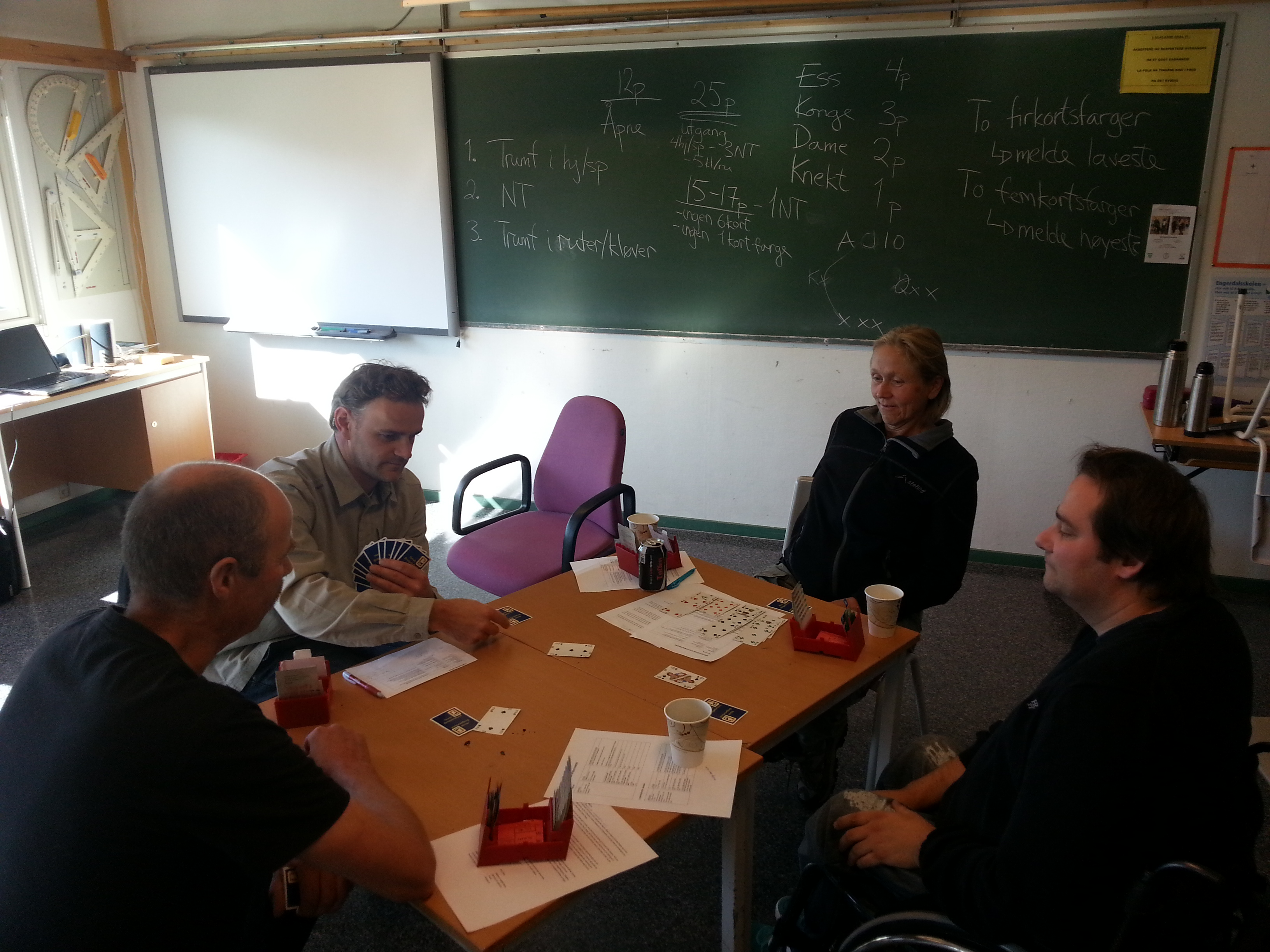 Lørdag og søndag hadde vi fire kursister på plass på EBUS. Dette er noen færre enn vi har hatt de to foregående årene, men vi er allikevel godt fornøyd. Tord gikk kurset for andre gang, mens Erling, Didrik og Unni gikk det for første gang. Erling og Didrik var helt ferske, mens Unni var glad for endelig å ha fått litt teori i bunn. Kurset var lagt opp med lite teori og mye spilling, og de håpefulle talentene fulgte raskt opp. Finesser og overføringer ble etterhvert samtaleemner, og aggressive meldinger førte til kompetitive meldeforløp. Dette lover godt!