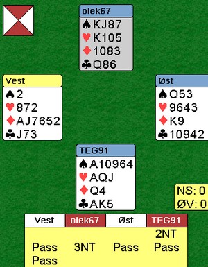 Når man har mange trumf til sammen, er kortfarger veldig viktig. Under er et nytt, spennende 1.divisjonspar for Vestfold, Ole Kopstad og Tor Eivind Grude, i aksjon. 3hj viser singel og 4ru singel/renons. Hvis syd ønsker å cuebidde med ekte kontroll, må han gå veien om 3NT først. Legg nå merke til hvordan nord sin hånd vokste til himmels. Han vet at makker likte singel hjerter og med 865 i ruter mot makkers kortfarge, er det ingenting bortkastet der heller. Nord kan likvel ikke ta kommandoen med Blackwwod, fordi han vet ikke om ruteren er singel eller renons. 5kl viser maks for tidligere meldinger og spiller ballen tilbake. Flott meldt!! Så kommer det jeg kaller et tøysespill. Selvsagt kan det være rett å spille 3NT, men nord bør absolutt sjekke om makker har fem spar først. For nord kan både kløveren og ruteren være åpen. Joda, kanskje uflaks at de manglet ruterhold og at vest hadde ruterutspill, men fortjent staffet spør du meg.