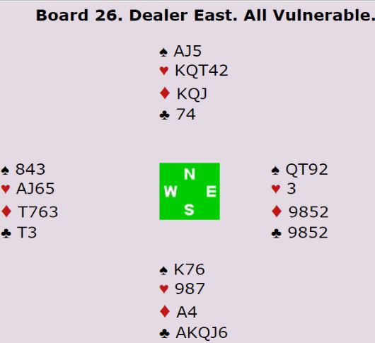 Bogø-Sivertsvik (mix) fant toppkontrakten 6NT, men spillet ble uavgjort siden 6 hjerter ble vunnet ved det andre bordet.
