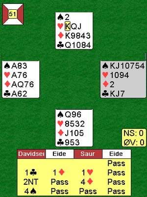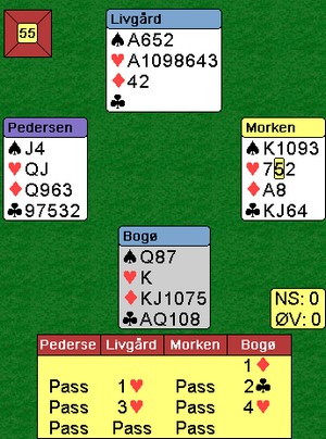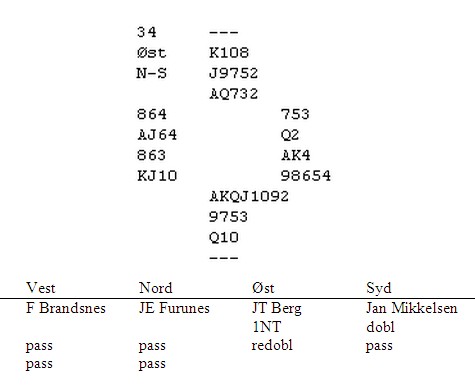 fordi dette spillet gjør at det er håp for de fleste av oss. Vinnerne av lagturneringa i Cavendish kom til 7ru dobla NS på dette spillet. Det var 1400 i beit i en frivillig meldt storeslem. Noen bedre?