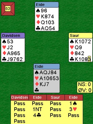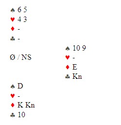 FLERE DAMER ENN PÅ MANGE ÅR Det er gledelig at damene også begynner å invadere de største turneringene. Å innvadere er vel kanskje ikke rett ord å bruke, men jeg kan ikke huske sist så mange som syv av 104 spillere er jenter. Aud Veseth ligger på en flott andreplass. Skal vi få damemedalje for første gang på lenge? FV: Rønnaug Asla, Pernille Lindaas, Astri Margrethe Grønnesby, Maja Rom Anjer, Torild Heskje, Anita Ower og Aud Veseth STILLINGEN ETTER DAG 1 ET SPILL MED MANGE SKVISMULIGHETER De fleste kom i 4hj i nord, men minst en spilte kontrakten fra syd og fikk kløver ut fra vest rett opp i ED. Det forsvant to ruter og elleve var sikret. Så hjerter konge, kløver til stjeling, ut med trumfen og en liten spar mot bordet. Øst stakk og nå lå kløver ti singel igjen i bordet. Det ble fristende for øst å ta for kløver knekt og fjerne bordets kløver 10. Det skulle han ikke gjort, for med fire kort igjen er dette stillingen: Jeg har fjernet vest sine kort fordi han er ikke med i spillet. På hjerter tre ser du sikkert at øst er ferdig. Det kom en analytiker inn til meg og sa at øst kan bryte denne skvisen ved å spille mer spar når han er inne på kongen! Javel, sa jeg, satte meg i nord og slapp sparen til esset. Nå tar jeg alle trumfene unntatt de to siste. Stillingen er: Jeg tar for den nest siste hjertern og øst er trumfskviset. Kaster han kløverknekten eller ruteresset, går det spar til damen og avkast av en spar på det godspilte kortet. Kaster han en spar, spiller jeg spar til damen og stjeler et minorkort. Spartassen gir det siste! STILLINGEN ETTER RUNDE 19 ALLAN LIVGÅRD TRAFF RUTEREN i dette spillet. Å få overstikk er jo det parturnering handler om og han spilte slik: Øst fant et greit utspill med hjerter fem. Allan vant med kongen, stjal en kløver, hjerter ess og hjerter 10 tok ut trumf. Så ruter til kongen (!), kløver ess og bort med den andre ruteren. Øst fikk to sparstikk til slutt. Et resultat i takhøyde. Jeg spurte Allan hvorfor han spilte til kongen og ikke tok kappen. "Sett deg i øst sitt sted og spill ut. Med ruter damen foran bordets femkort-farge, ville du ikke spilt ut aktivt? Når han startet med trumf, var det mye som tydet på at han hadde esset. Det jeg tenkte på, var om han kanskje hadde ED og at det likevel var rett å kappe. Det er også mye som tyder på at øst har sparkongen, siden han ikke startet der. Et argument for å kappe ruteren er at en kan gjøre seg uavhengig av sparfordelingen, men det er også skvisvarianter i sluttspillet bare jeg får beholdt overgangen i spar" DET ER KANSKJE DÅRLIG GJORT av meg å skrive om slike spill som det under, men hjerneblødende misforståelser er jo en del av bridgen? Jeg skal ikke en gang prøve meg på å fordele skyld, unntatt å si at det var Eide som meldte galt. PRISEN SOM FORSVANT? Terje Lie er en glimrende spillefører og når han traff sparen i dette spillet, gjorde jeg meg klar til å innstille han til prisen for beste spill.
