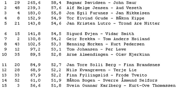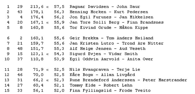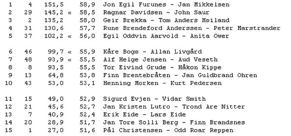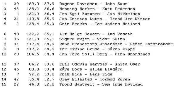 Den 11. september stakk Willy og Torstein av med seieren med 58,9% foran Herman og Johnny. I gårsdagens dyst var det Øyvind og Tore som var best med 59,7 foran Lars Erik - Per Arild og Rolf - Simon på delt andreplass.