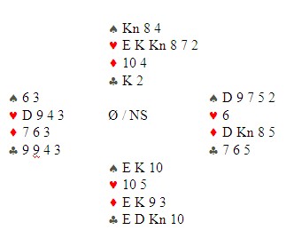 Kløver ut til kongen, hjerter til Ess, hjem på ruter, hjerter 10. Om den dekkes eller ei spiller ingen rolle. Nå må vi spille ruter honnør og ruter til trumf, kløver til esset og kløver til trumf, spar til finesse (den må gå) og en spar honnør som vest må følge på. Nå kommer stående kløver. stjeler vest er det over, gjør han ikke er pinen utsatt til tolvte stikk der D9 sakses opp av Vests KJ. Det ser så greit ut, men det må times riktig.