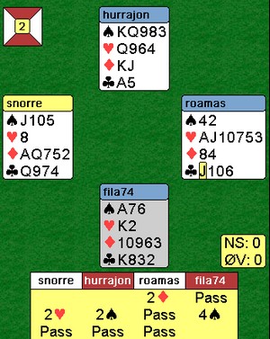 Ikke at det var det vanskeligste spillet i verden, men likevel Han stakk kløveren med esset, spar konge, spar til esset og ruter. Jeg stakk med esset og spilte mer kløver til kongen. Jon stjal en kløver, tok for ruterkongen og ut med trumfen i posisjonen under. Nå var det bare å spille hjerter og hjerter dame ga det tiende og siste stikket.