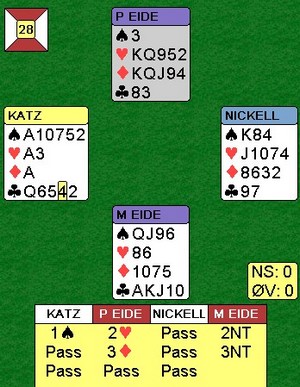 I A-Pulja hadde Kolbotn BK 1 et vanskelig utgangspunkt med 25 IMP bak etter første halvdel. Vi spilte neste jevnt med Fredrikstad BK, men tapte med 3 IMP. Deretter skulle vi møte et bra Askim lag, med både Allan Livgård og Steffen Fredrik Simonsen på laget, samt Henrik Livgård og Stig Henning Dybdahl på laget. Første halvrunde gikk brukbart, og 18-19. Derimot fikk vi juling i 2 halvrunde. Spilte bort en kontrakt som stod, og en håpløs melding og spilleføring til -800. I en kontrkat velger Henrik å åpne på 10 poeng og A Q x x x x i kløver. De finner den perfekte stampen i 5 kløver, hvor 4 spar står vår vei. Dyrt når vi er i sonen. Heldigvis hadde Per og Eva meldt en 6 hjerter. Slik at vi tapte 1/2 halvrunde med 13 IMP. Posisjonen til Kolbotn BK1 er ikke bra med en forløpig 8 plass av 10 lag. Neste kamp er mot Fredrikstad 1, som vant i fjor, men nå ligger på siste plass. En tøff kamp, og jeg tør ikke å spå noe her.