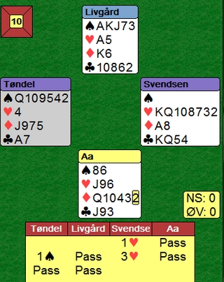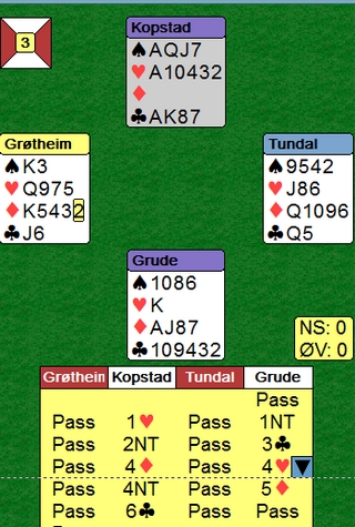 Bjørg Lystad valgte kl 2, Jan P. Johannesen stakk med esset og spilte ruter. Jeg valgte å legge lavt og Bjørg fikk for kongen men fortsatte med kløver. Inne på bordet tok jeg så for sp A og na Ø fulgte lavt i neste runde ble sp 10 forsøkt. Bjørg vant med kongen, rett valg tydeligvis, men hva hjalp det. Lystad fortsatte med nok en kløver og Johannesen fikk stjeling med sp J. Taperen i hjerter var ikke til å unngå og det endte med 8 stikk- bunn og ren! Salen for øvrig fikk 10 stikk (3 bord) og 9 stikk (2 bord) mens 1 bord i 1 NT klarte 9 stikk. En slenger i 3 ruter av Ø gikk 3 bet.
