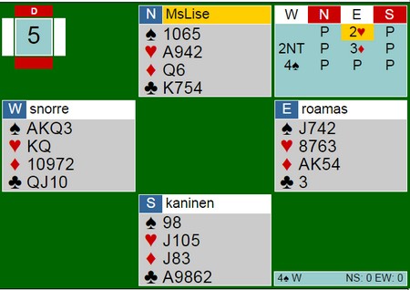 Lise Blågestad fant eneste utspill som ga meg problemer, spar, men det burde gått greit likevel. Jeg stakk på hånda, ruter til esset og kløver mot. Håpet var at kaninen stakk opp med honnør i forhånda slik at jeg kunne presse ut den andre honnøren. Det skjedde ikke og Lise kom inn på kongen for å spille mer trumf. Nå blødde jeg og oppdaga at jeg hadde krøkka til hele spillet i det jeg la ned hjerterkonge med håp om at den som hadde esset ikke hadde den siste trumfen. Jeg fikk kasta ruter, men hadde ødelagt forbindelsene mine. Trykk på spillet for å se fadesen. Det jeg skulle gjort, var å vinne ti stikk ved å stjele en ruter i bordet! Jo, jeg snakker selvsagt sant. Stikk den første sparen og spill kløver. Stikk neste trumf og mer kløver som jeg kaster en ruter på. Nå står den siste kløveren for avkast av enda en ruter. Jeg har forbindelse til både å ta for EK i ruter, stjele god den siste og hente den. Jeg kunnde også vunnet ved godspille den andre hånda og stjele to hjerter hjemme med EK i ruter som overgang. Skuffende!!