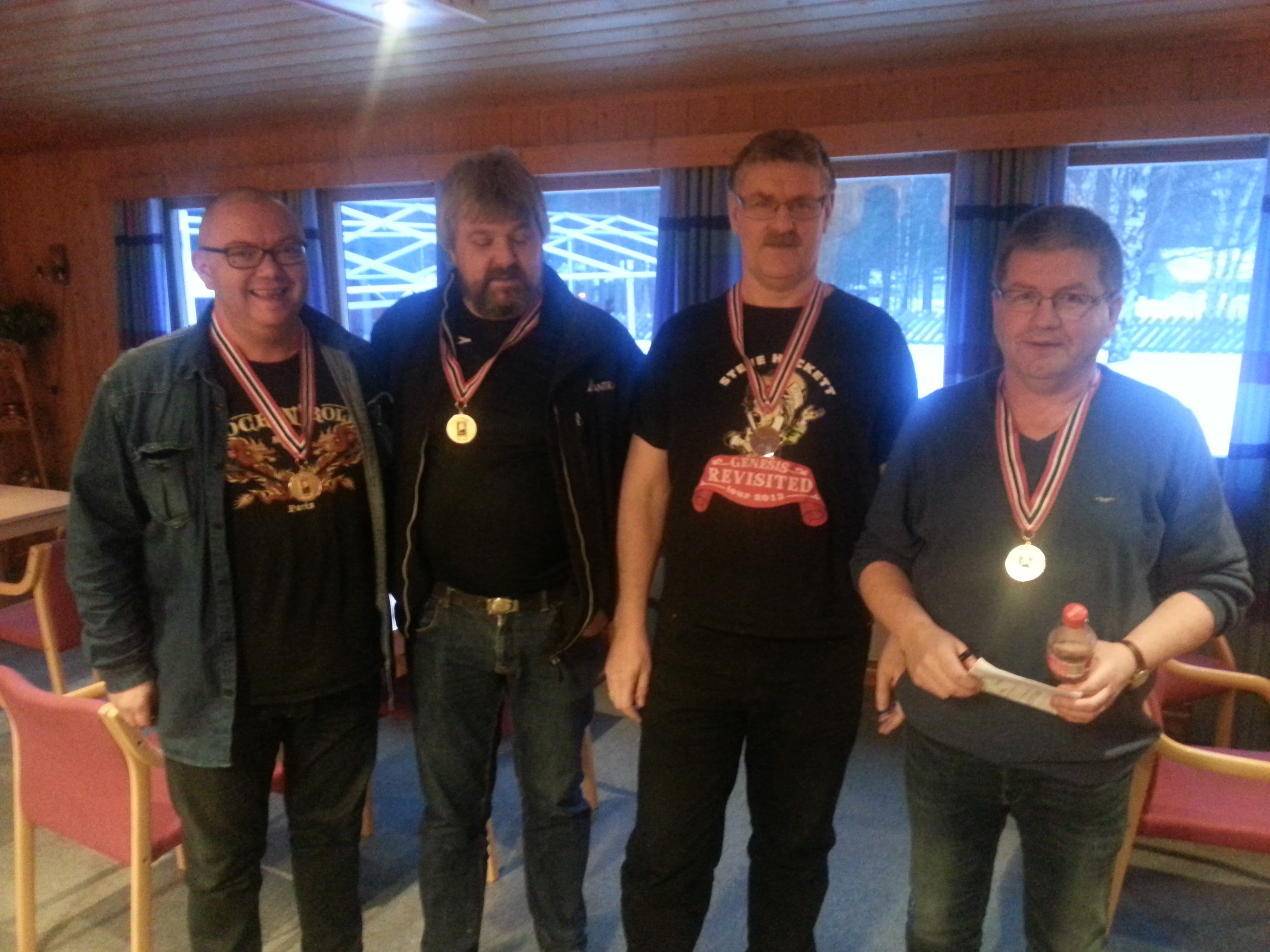Årets vinnere i 4. divisjon Rendalen: Jon Sagbakken, Trond Magne Aasheim, Borgar Lunheim og Eivind Moen. Trond Magne kikker beskjemmet ned i gulvet etter sju slemmer på rad som ikke stod, uten at det hindret gutta fra seier og opprykk.