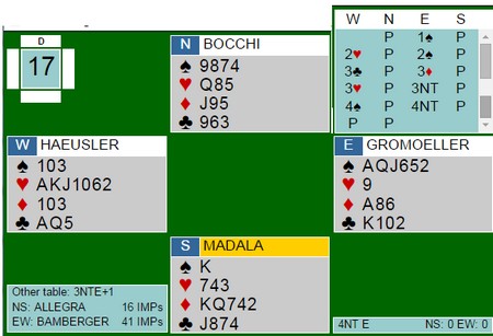 Øst passer (!) 4NT og går tre beiter med ruter ut. Det er "bare" å dukke ruteren to ganger og så ta hjerterkappen, men en like god spilleføringi 4NT er kanskje EK i hjerter og så sparkappen. Dette fordi at en kan ikke se at ruteren sitter 5-3. Slik spilte tyskeren og gikk to beit. I 3NT er det opplagt å lasje ruteren to ganger og så seile hjerter ni. Skulle nord ha en ruter til, sitter fargen 4-4 og 3NT går enda hjem. Det blir beit kun hvis nord har hjerterdamen sammen med femkort ruter. Ikke akkurat imponerende at ingen av lagene klarer å komme i sparkontrakt der det alltid er minst elleve stikk.