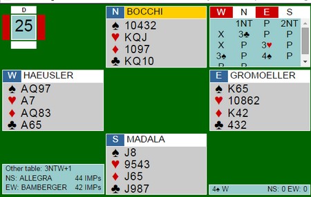 Det enkle er det beste og de beste spillerne spiller ofte enklest. En tror gjerne at toppspillere vinner turneringer fordi de vrenger finesser, topper ut konger og finner tosidige skviser med forsinket tempo. Neida, de spiller ofte på beste sjanse og kan sin matematikk. Begge to fikk ruter ut og italienske Duboin tok dobbelfinessen i hjerter for sitt niende stikk. Tyskeren Heusler prøvde seg på en artistisk variant og gikk beit.