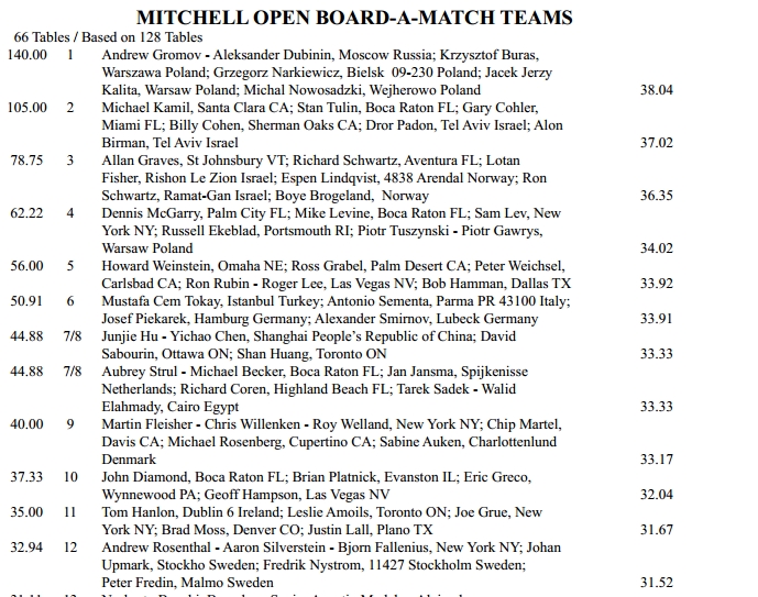 (og Boye kan si akkurat hva han vil om resultatservicen. For oss som ikke er tilstede, er det umulig å finne pålitelige ting før bulletinen kommer. Jeg søker under LIVE og der er det ingenting om denne turneringa og under "Results" er det Peter Bertheau sitt lag som er på topp. Nei, takke meg til oss her hjemme.)