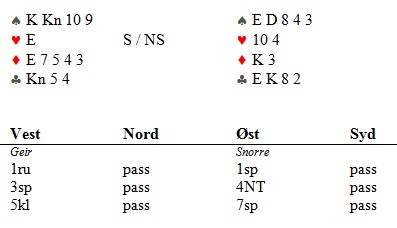 Jeg skal ikke påstå at jeg meldte veldig vitenskapelig i øst, men jeg visste at hadde makker kløverdamen eller ruterdame måtte det være fint spill for 7sp. Nå hadde ikke Geir noen av dem og da sto kontrakten på ruteren 3-3 eller kløverdama dobbel. Omntrent 45,6 % tipper jeg. Om det sto tretten stikk eller ikke spiller ingen rolle. Jeg skulle nok meldt 3NT over 3sp. Da tipper jeg Geir går ned i 4sp med minimum for 3sp og da legger jeg meg kanskje til på 6-trinnet? De fleste mener at Geir sin 3sp er for hardt. Jeg liker heller ikke å oppvurdere slike hender når en enda ikke vet noe om makkers kort. Vest sin ruter er flott hvis makker har rutertilpass, utem ruter hos makker er det en helt normal 12-14. Singel hjerteress kan være bra og det kan være ubrukelig til noe mer enn å ta et stikk. Knektene kan tette farger eller de kan være to unyttige glansbilder. Jeg liker normalt ikke å spiintre singel ess, men det er jo singel hjerter (og delvis 5-4-3-1) som gjør at hånda kan være bra. Derfor er jeg ikke uenig med Nils som sier at "Skal du melde noe annet enn 2sp, er 3hj nærliggende." Hopp til 3sp viser normalt 15-16 hp og en hånd som ikke passer for 1NT eller en ubalansert hånd som ble veldig sterk når makker meldte spar. Gi deg en ruter mer og et par kløver mindre, f.eks KKn109,E3,EKn9543,3 og 3sp er nesten en undermelding selv om den har bare 12hp. Eller ENDA bedre om en flytter på hjerteresset til kløver: KKn109,3,EKn9543,E3. Med den siste hånda vil makker hoppe til 3hj, et hopp som ikke nødvendigvis betyr ekstra honnørstyrke. Hoppet til 3sp forventet jeg mer enn 13hp og en litt tam 5-4-3-1 hånd, men jeg skjønner selvsagt Geir sin tankegang.