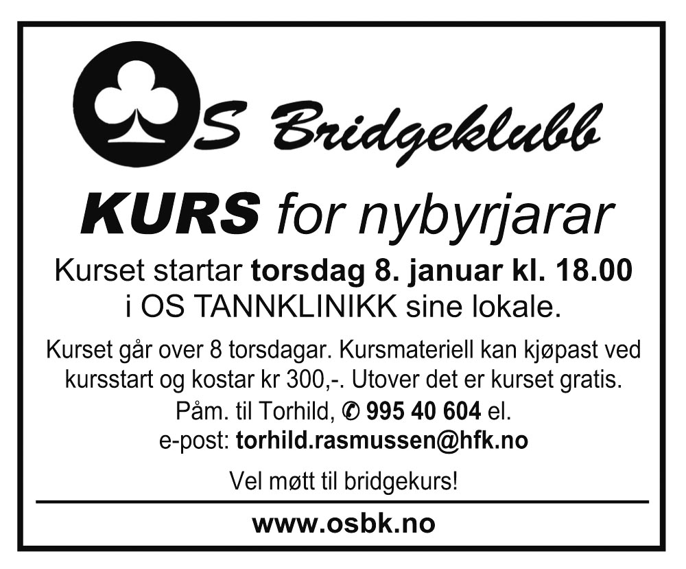 Komande tysdag er det julebridge, julebord og julegåver som står på programmet. Sogndøler og gåpningar m.fleire er hjarteleg velkomne. Pris kr.275 som inkluderer startkontingent og juleribbe med dessert. Og som alltid, vil du ha julegåve lyt du og ta med ei.