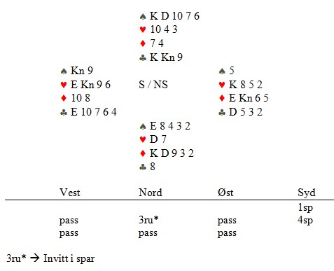 Slik gikk meldingsforløpet ved vårt bord. Nord har en vanskelig melding i første runde. 2ru viser som regel minst fire, men alternativene er heller ikke fristende. 2NT vil vise fire spar og er krav til utgang (for hardt), mens 3sp vil vise 10-12poeng (for svakt?).