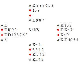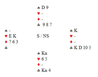 I lukket Rom fikk Vikersund spille hjem 4sp for +420, så selv om Øyvind skulle gått beit i 5ru ville det blitt et plusspill til Buskerud. Men Øyvind ordna biffen med en utrolig oversikt i sluttposisjonen. Erik Berg starta med spar ess og skifta til kløver. Esset vant stikk og så seilte ruter 9 rundt (!). Nord hadde vist blakk i ruter med sin 4ru, så det var sikkert ikke noe kunststykke for stjørdalingen. Kløver til stjelling og kongen kom på. Spar til røff og ruter til damen. Så alle ruterne untatt den siste. Posisjonen er over. Ruter 4 og Erik Berg i Nord må ned på E10 dobbel i hjerter for å holde kløver 10x. Bordet kvitter seg med kløver 9. Hjerter til damen og en liten hjerter fra hver hånd. 11 stikk.