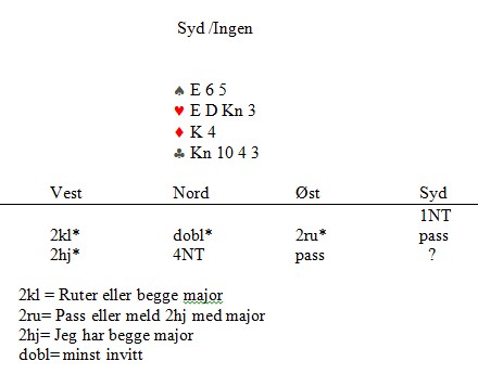 A: Makker spør etter ess B: Makker melder en naturlig kvant (invitt til slem) C: Makker har begge minor. F.eks kan ditt svar være slik: A: 20% B: 50% C: 30% Har du en sterk mening, kan du selvsagt gi 100% til et av svarene.