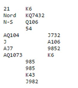 Vest spilte ut hjerter åtte , og etter to ganger trumf la Paul ned ruter ess, tre ganger kløver og bort med en ruter. Ruterstjeling, trumf til bordet og en kløverstjeling. Liten spar, og nå sprellet Vesty i garnet. Enten spar til spilttet saks eller ruter til dobbel renons. Well done, Paul!