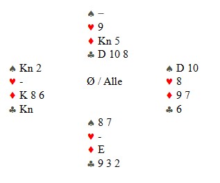 Festus spilte ut en liten hjerter og kontrakten var ubetelig. Jeg var nok litt skuffet, da jeg satt med følgende kort:: AKD1073 - 83 - 109 - K76.