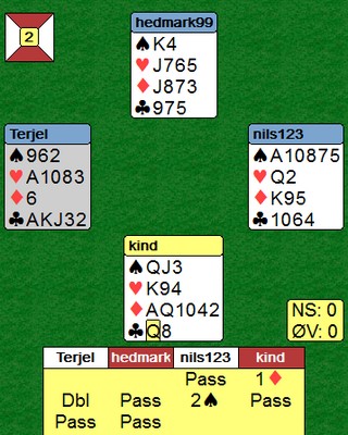 Asbjørn Kindsbekken gjorde sitt beste, men det hjalp ikke. Kontrakten var bare 2sp, men sånn for spenningens skyld kan du jo late som Nils Kvangraven spilte 4sp.