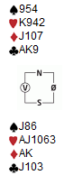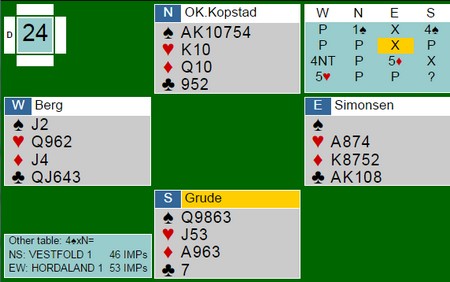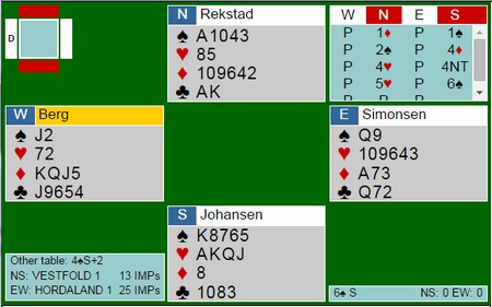 5-trinnet er vanskelig. Det er vel ingen av oss som har angret på aksjoner v har gjort. Tar vi ut er det feil og melder vi er det også galt. Her var det riktig å ta ut med vest sine kort. Konsekvensen er at de gangene øst sitter på beita i 4sp, må han passe fordi makker ofte tar ut. I alle fall de gangene han har llitt fordelilng. På det andre bordet gikk det likedan helt til doblingen. Der passet vest og måtte betale ut 590. Hvem at nord/syd som skal doble 5hj, vet jeg ikke. De har ikke peiling på om ØV sleminviterer eller stamper. Fin storeslem fra Berg - Austberg 3hj viser minst fem spar og 3sp viser trekort-støtte. Så forteller vest om tre av fem ess, kløverkongen og hjerterkongen. Det var nok for øst. Kontrakten er ikke nedlegg, men når kløverdamen falt tredje gang, var det tretten lette stikk. Spiller gikk ut i kampen mellom Vest-Agder og Hornslien når Brekka - Høiland også meldte 7sp I spillet under hadde Erik Berg uflaks for en gangs skyld. Her var det mange som kom til 6hj med EK i trumf vekk. Med sparkongen ut kan ikke 5hj vinnes heller fordi øst kommer ikke inn i tide til å få kvittet seg med spartaperen etter spar konge i utspill. Litt surt å vinne bare 1 IMP når motparten er i slem på andre bordet. Her sniffa Thomas Charlsen fint i 4hj. Trykk på spillet og velg spill 17.