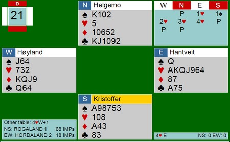 Espen Lindqvist på det andre bordet fant ikke ressurser til å melde 3ru og da gikk det sånn. Trykk poå spillet og velg spill 17, lukket rom.