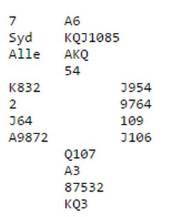 Med åpne kort ser det helt galematias ut å slippe på 6hj, men i praksis ikke så lett. Det var flere som fant kløver knekt i utspill mot 6hj. Den går via kongen og esset. Mer kløver dreper bordet slik at ruteren ikke kan utnyttes!! i 6NT er det ingen problemer med dette utspillet, men nå sliter spillefører. I stikk 3 dro Espen Larsen spar dame fra bordet og stakkars Nils Kvangraven i vest visste ikke hva han skulle gjøre. Har spillefører EJ dobbel og bare EKx i ruter, vil alle le av han som dekker. "Hvem er det som spiller sånn uten EJ i spar på hånda,da?" Spardamen sto og et spill for historiebøkene. Det er bare å bøye seg i støvet for sånt svindel, Nils!!