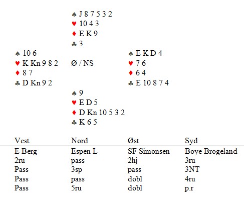 Dette spillet er fra en av toppkampene i forrige helgs Seriemesterskap. 2ru er såkalt "Søppelmulti" og viser en majorfarge med dårlige kort. Steffen Fredrik Simonsen dobler for å få spar ut og da rømmer Boye. En svært tøff løft til utgang av Espen, men det så ut som det ikke var noe bortkasta i spar og singel kløver var jo bra? Erik Berg spilte etter lang betenkning ut spar 10 og nå skjønner du sikkert overskriften. Boye dekka med knekten og øst vant. Hjerter tilbake til esset. Ruter til bordet og spar åtte fra bordet. Øst dekket og nå falt spar seks i vest. Ruter til bordet og spar syv (!). Når ruteren satt 2-2 og kløveresset foran, skjønner du at det ble den nette scoren av +550. Flaks, kaller vi andre dette. Bytt om spar fem og spar fire, så koster det minst 300. Erik Berg burde absolutt funnet utspillet i trumf. Makker har sparen og han selv kontrollerer hjerteren og kløveren. Da må nesten NS sine stikk komme i trumf og da er det best å starte der.