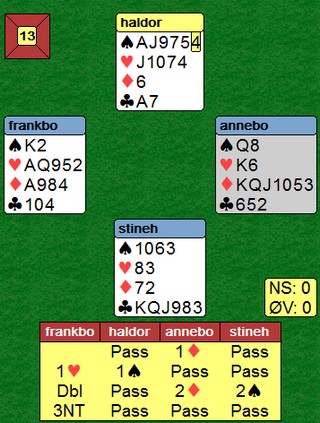 Jeg var ikke enig med Stine Holmøy i dette spillet. Jeg ville meldt 2kl over makkers 1sp. KDKnxxx er alltid vedt å melde. Det kommer helt sikkert anledning til å støtte sparen senere om det skulle være aktuelt. Makker i nord spilte selvsagt ut en spartass og da føyk 3NT hjem.