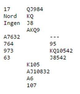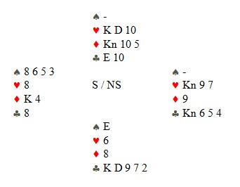 Ronny Kollnes spilte ut spar knekt til kongen i bordet. * 2ru viser hjerter og 3ru er naturlig GF Så ruterdamen til kongen og spar 10 til esset. Hjerter mot bordet måtte Ronny stikke. Hvis ikke godspilles ruteren lett og ti stikk. Spar ni fikk beholde stikk og posisjonen er som under når Ronny spiller enda en spar. Jeg er skviset og må kaste ruteren min, og Geir leste sitsen glimrende. Tre ganger kløver fra topp og så ble jeg puttet inn på den fjerde og måtte avslutte med å gi bort tre hjerterstikk. Flotte greier fra sør-vest landet!! Legg merke til at det er helt avgjørende å lasjere den tredje sparen. Hvis ikke kan jeg beholde en ruter til makker. _______________________________________________________________________________