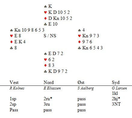 Hege Sundland skulle spille 6sp etter at øst hadde hoppa inn med 2NT for å vise begge minor. Ruter ut og nå så det trist ut. Hege fant den eneste planen som kunne lykkes, nemlig at sparen satt 5-0! Derfor dro hun tre ganger hjerter og kasta ruteren sin. Nå var det hele tegnet og det var bare å passe på ikke å bli for kort i trumf. Det gikk selvsagt greit. Glimrende spilt!!