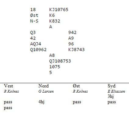 Jeg har prøvd i snart tretti år og endelig lyktes det!! Jeg startet med ruterdamen som "selvsagt" sto. Jeg kunne ikke se enda hvem som hadde dobbel ruter, men jeg visste makker hadde spar esset eller hjerteresset. Skift til spar i tilfelle spillefører måtte gjette den fargen. Knekten vant, men på hjerter fra bordet gikk Ronny Kollnes opp på esset, spilte ruter til mitt ess og ruter til stjeling. Det går sikkert tretti år til neste gang jeg lykkes, men det er verdt å vente. ___________________________________________________________________