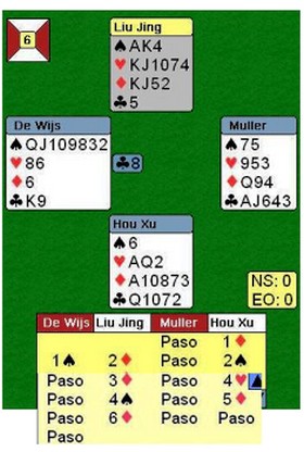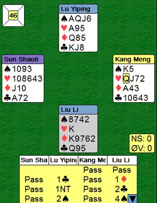 En må ha hovedfag i matematisk kombinatorikk for å skjønne hvordan sluttspillet i Yeh Bros funker, i alle fall hvis en ikke har fulgt med hele veien. Det er noe med trekantspill, der beste lag av tre møter vinneren av en tidligere kvalifisering. SE HER SÅ FINNER DU SIKKERT UT AV DET. Tar jeg ikke helt feil er det "Red Bull" og "China Open" som kjemper om seieren. Her er hvem som spiller på de ulike lagene. De norske, Boye Brogeland, Erik Sælendsmind og Terje Lie, er alle utslått for en god stund siden. De spiller et Monrad slutspill, men det går ikke all verden der heller. Resultater finner du (kanskje) i linken over. _________________________________________________________________________ Her er et spill der god teknikk ville ført til vunnet kontrakt.