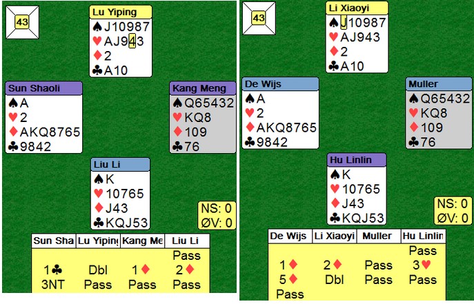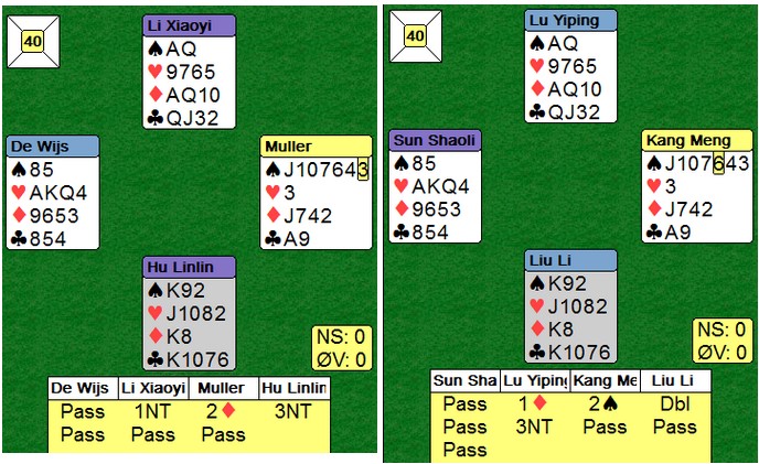 var en spennende affære mellom to kinesiske lag. Det ene var forsterket med hollenderne Simon De Wijs og Bauke Muller. Halvveis ut i den tredje sesjonen er det helt jevnt og dette spillet synes jeg viser noe av nivået. Jeg og du ville kommet i 4hj og gått en beit. 3NT var uavgjort spill i denne kampen etter gode vurderinger på begge bord. Så et av de siste avgjørende spillene: 1ru over 1kl (sterk) viste begge major. 3NT var tøft meldt, men i praksis var det ikke mulig å spille ut noe annet enn en liten hjerter vel? Skulle syd heller hoppe til 3hj som på det andre bordet. Da sliter vest. Spar knekt beiter faktisk også, fordi at selv om sparkongen kommer seilenede, er det ikke mulig å få henta det niende stikket siden bordet ikke har kjapt nok inntak. 5ru kunne ikke vinnes og 11 IMP til China Open. De leder 103 - 91 med seks spill igjen. Det er nesten 1.000.000 NOK i forskjell på første og andreplass! ________________________________________________________________________________