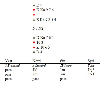 Jon Solli Hansen er en av de aller ivrigste her i Kristiansand. Metodene hans for å gjøre det godt i bridge er det mange av oss som undrer oss over, men han har en egen evne til å komme ned på beina. I det lange løp er det resultater som teller og vi som ikke kom til 3.runde en gang, har ikke så mye vi skulle ha sagt. Jon spilte 6.runde i helga og tapte med 23 IMP. Han var ikke storfornøyd med egen innsats og innrømmer at han i minst et par spill falt for eget grep. Jon er sinnykt opptatt av renonser og alltid på jakt etter gulltilpass. Han satt blant annet med denne hånda i ugunstig sone og hørte MTV åpne med 1hj, makker passet og MTH meldte 1sp. - 4 KDKn1076 EKDKn32 Vest Nord Øst Hurra 1hj pass 1sp dobl (!) og doblet altså opplysende ! "Jeg hadde planer om å få hoppet til 4sp etterpå som Exclusion Blackwood og undersøke om makker hadde et rødt ess. Da melder jeg slem kontrollert". Ingenting å si på viljen, i alle fall. For det første har ikke makker noe ess i dette spillet, Jon. For det andre er vel ikke hopp til 4-trinnet Exclusion Blackwood i det hele tatt. Om så skulle være, så rekker du neppe å fastlegge trumf. For det tredje får du aldri i verden sjansen til å melde i fred. Et direkte hopp til 4NT med disse kortene er rimelig opplagt i min verden. Kanskje blir du til og med doblet der. Skulle motparte ha tilpass, vet de ikke hva de skal gjøre direkte på 5-trinnet. Maks press så tidlig som mulig. Dette stemte, og neste gang Jon skulle melde, var motparten (selvfølgelig) på 4-trinnet. Nå meldte han 4NT, men motparten meldte kjapt på 5-trinnet og to passer til Jon. Reint gjettverk nå. Hva som hadde skjedd over 4NT, er det ingen som vet. Det er heller ikke poenget i dette. Så et spørsmål fra Jon til dere lesere. Du har fått utlevert i gunstig sone E8765 5 1073 8752 Makker åpner med 1hj og det kommer pass i mellom. Du får 100 poeng å dele ut. Hvor mange av dem gir du til pass og hvor mange til 1sp? Logg deg på og svar. Jeg lover å ikke skjelle ut NOEN av innsenderne, mest fordi at jeg har ikke veldig sterke meninger selv. Dere som kjenner spillet, ber jeg ikke ta hensyn til de aktuelle kortene. _________________________________________________________________