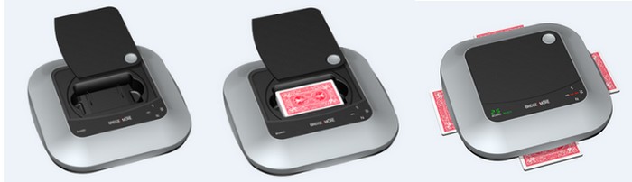 Kortene kommer ut gjennom de fire sidene av Dealer. Samidig som et spill spilles, klargjøres det neste. To kortstokker er alt som trengs pr. bord. _________________________________________________________________________________